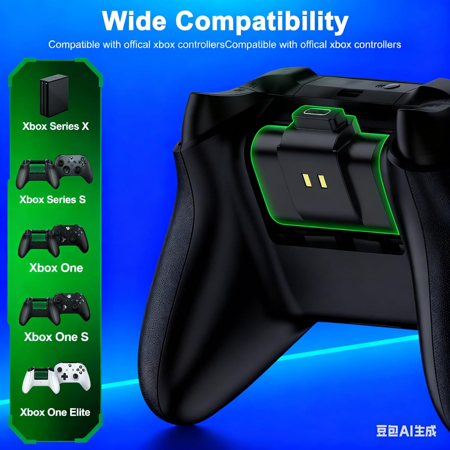 Battery and charger sets for Xbox; Compatible with Xbox One / Xbox One S / Xbox One X / Xbox Elite/Xbox Series S / X controllers; LED indicator light prompts, red light shows charging is in progress, green light indicates charging is complete; Over-charging, over-current, overheating, short-circuit protection