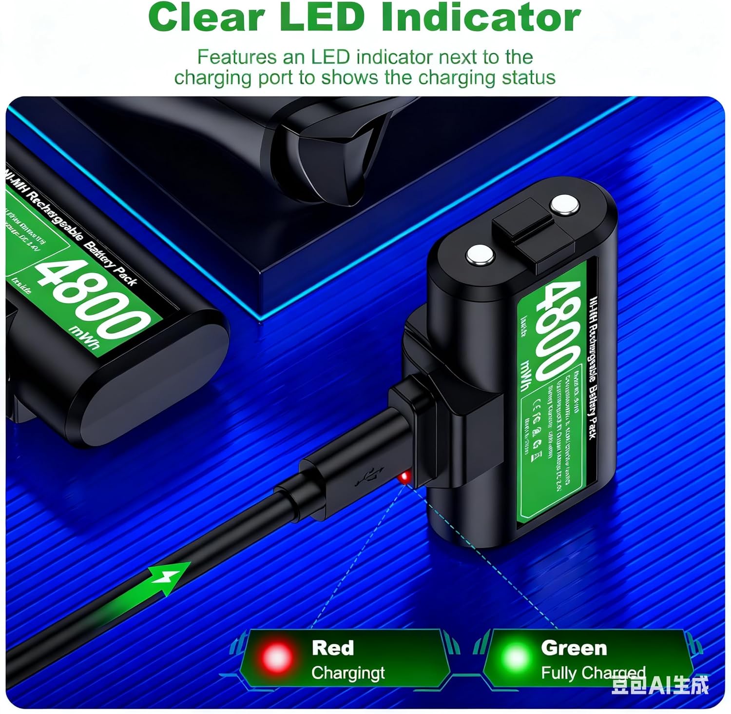 Battery and charger sets for Xbox; Compatible with Xbox One / Xbox One S / Xbox One X / Xbox Elite/Xbox Series S / X controllers; LED indicator light prompts, red light shows charging is in progress, green light indicates charging is complete; Over-charging, over-current, overheating, short-circuit protection