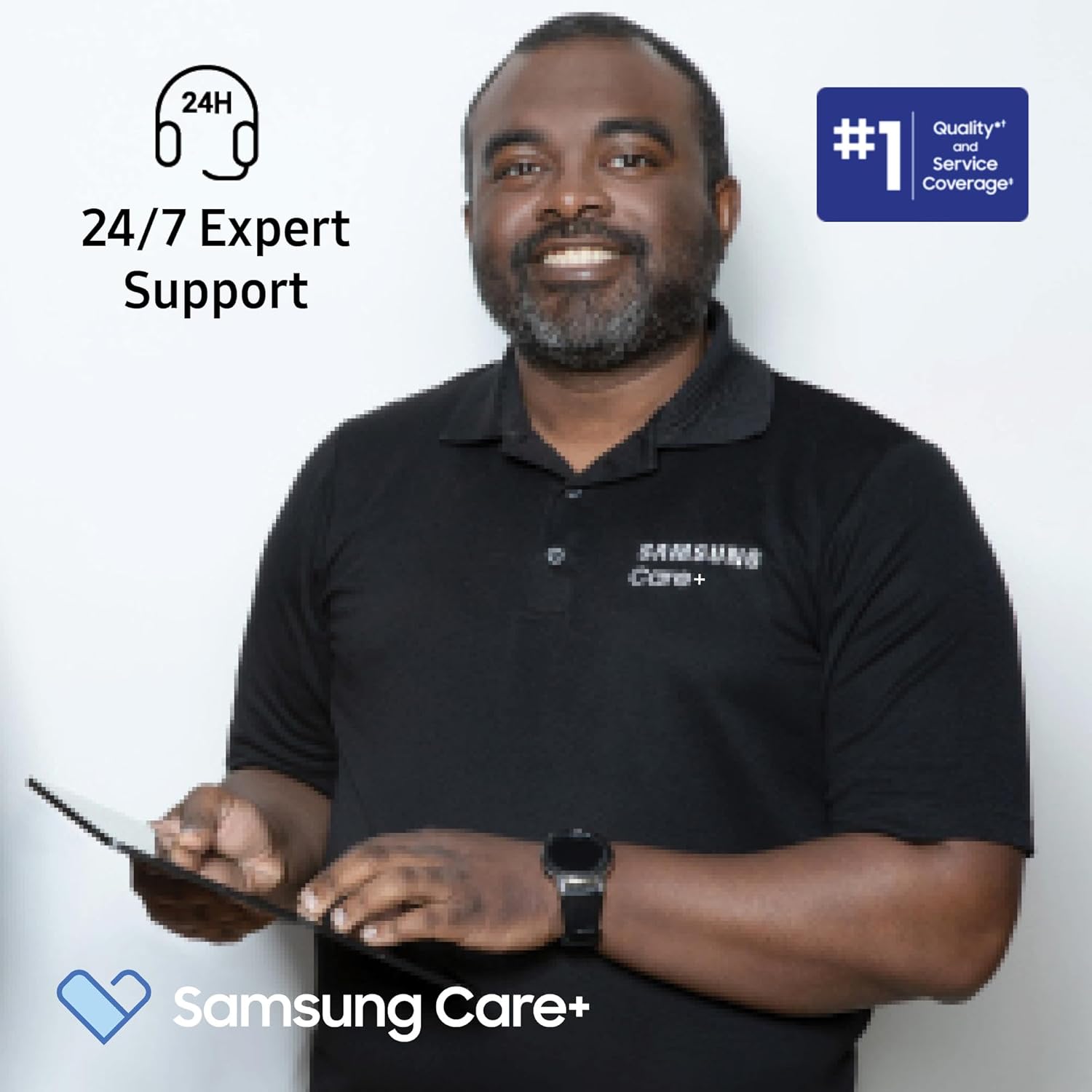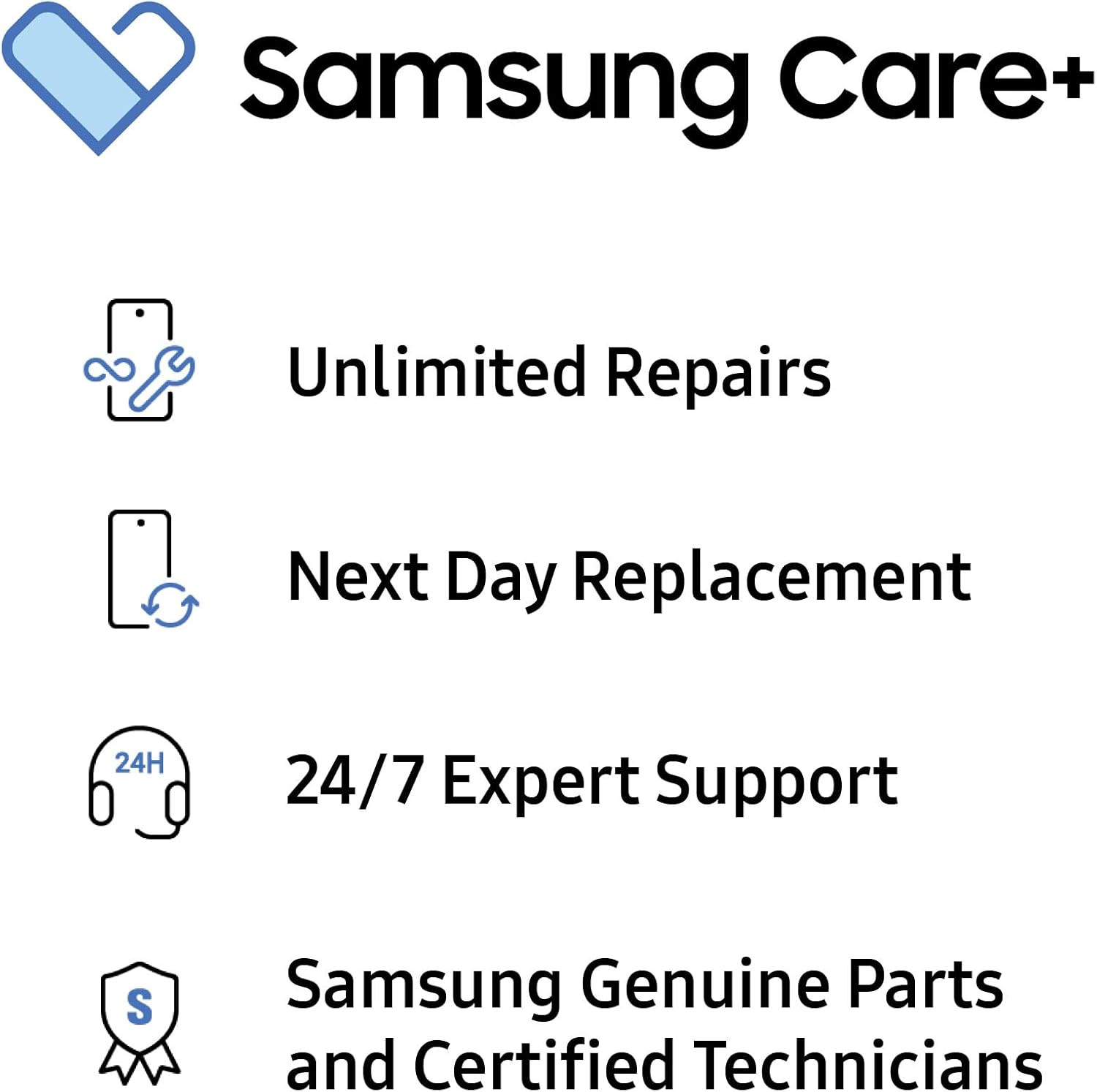 24/7 Expert Support: Get immediate answers from a Samsung Care+ expert 24/7 via phone or online for device setup, content transfers, and connecting with other devices.