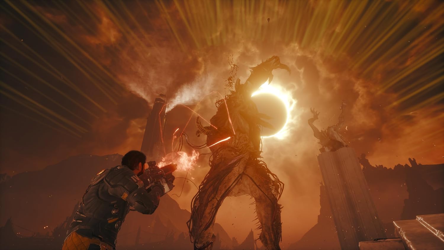 Discover a dark, personal story of a man bound to a world that corrupts everything it touches. Set on the shape-shifting planet Carcosa, SAROS is a standalone cinematic action experience from Housemarque. The story follows Arjun Devraj, a haunted Soltari enforcer driven by loss, regret and an unrelenting need for answers. Drawn into Carcosa’s violent beauty and cosmic horrors, Arjun searches for the truth behind the Eclipse: a sinister force that distorts the world, and everyone within it. As he fights his way across Carcosa’s mysterious biomes, Arjun’s journey pulls him deeper into a fallen civilization, towards unsettling truths about his own past. Along the way, he will encounter unlikely allies, fractured bonds and revelations far more devastating than he imagined. STUNNING GRAPHICS AND GAMEPLAY • Explore the haunting and ever-changing world of Carcosa as it reshapes after every death. • Travel through dreamlike biomes filled with alien ruins, shifting pathways and cosmic phenomena. • Uncover hidden areas, ancient structures and lost technologies that reveal Carcosa’s forgotten history. • Side journeys allow Arjun to discover deeper mysteries and encounter new characters across the world. MASTER BULLET BALLET COMBAT • Engage in fast, fluid, projectile-focused combat with Housemarque’s signature bullet ballet style. • Unlock and evolve powerful weapons, abilities and corruption-driven enhancements. • Build a personalized arsenal through permanent progression and adaptive playstyles. • Learn enemy attack patterns, parry, shield and dodge through intense encounters and boss battles. AN UNCONVENTIONAL STORY AND JOURNEY • Experience a layered, psychological narrative shaped by memory, loss and cosmic horror. • Return to the Passage between runs to meet the Echelon IV crew and track your progression. • Watch allies unravel as the Eclipse fuels paranoia, hallucinations and fractured trust.• Go beyond survival to uncover the true cost of your power and what it means to break free of the past.