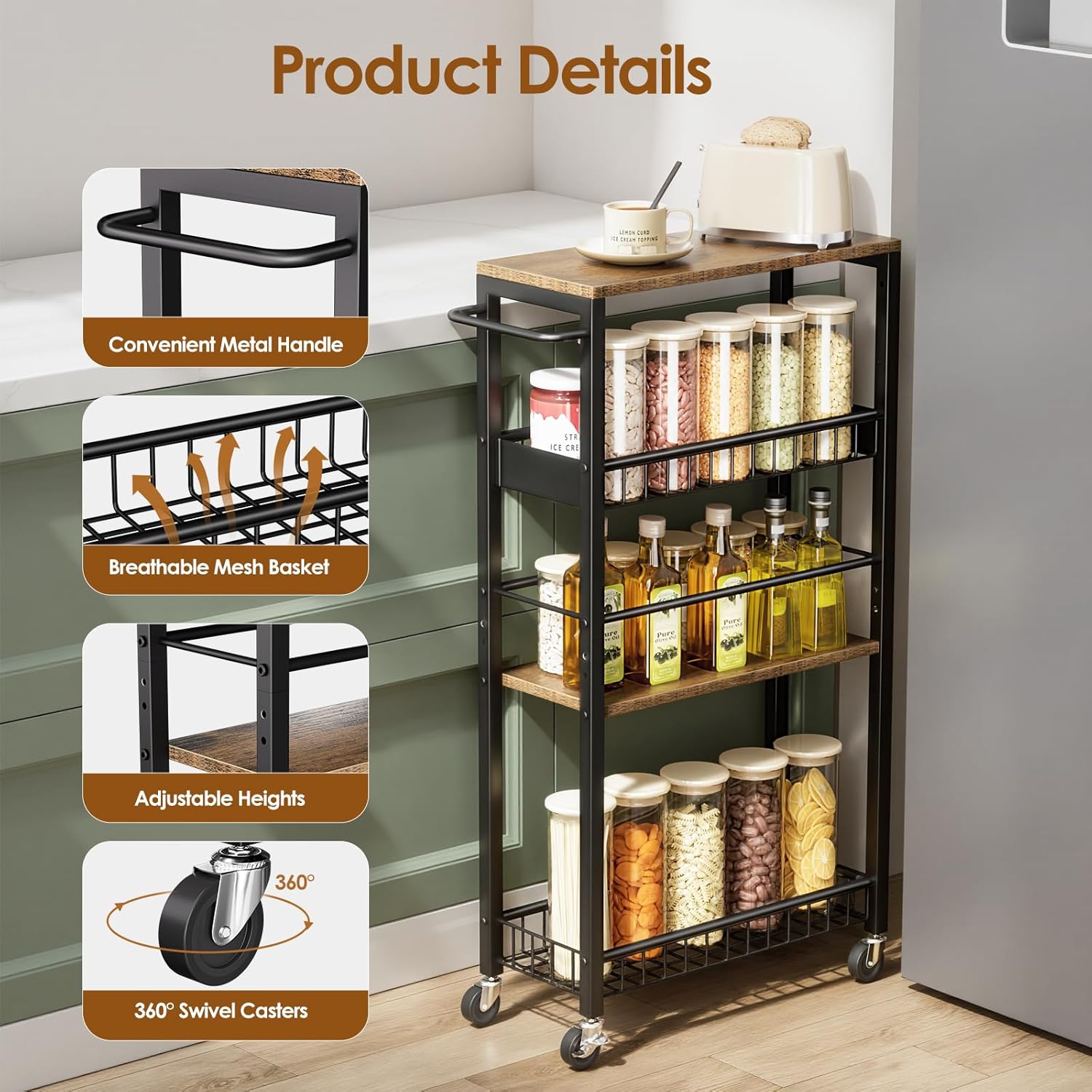 Large Storage Capacity:4-tier slim storage cart with wheels trolley features two mesh baskets and two wooden top, offering ample space to store all your essentials,ensuring maximum storage efficiency in a small space and everything within easy reach.