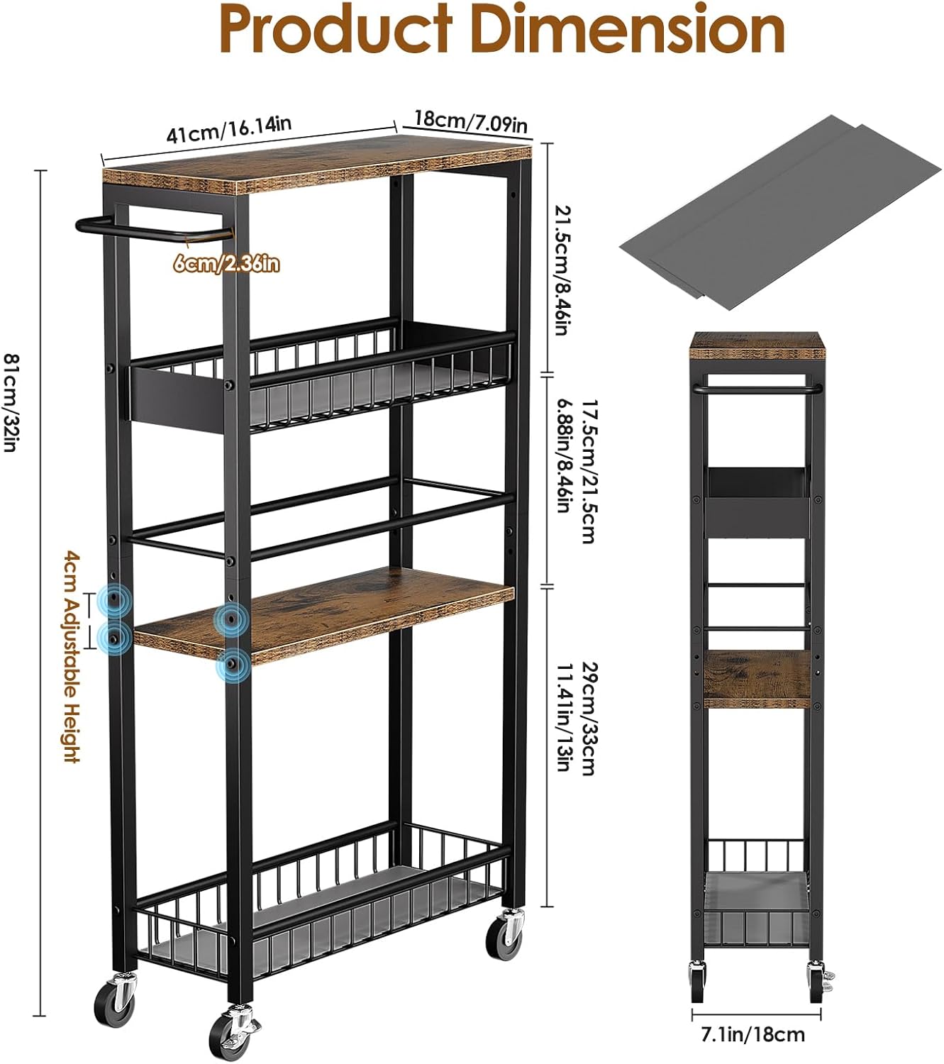 Adjustable Height: The height of the wood shelf under the slim cart is adjustable to fit spice bottles,toiletriesand other items. Effectively avoid wasting space and customize your storage layout according to your needs.