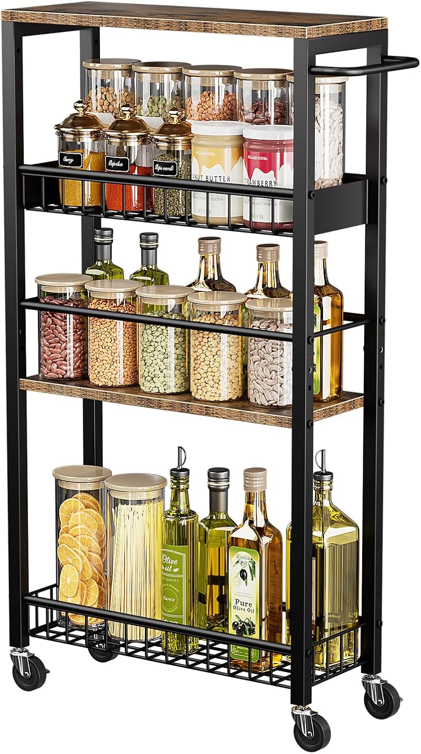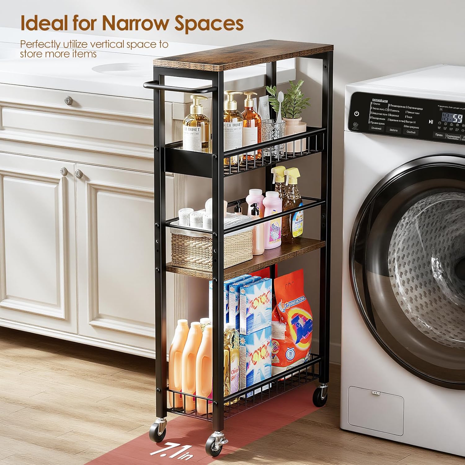 Slim Storage Cart for Tight Spaces: Design for compact spaces, with a slim 7.1 inch width for effortless placement in tight gaps and corners. This slim storage cart perfect for versatile storage in kitchens, bathrooms, laundry rooms, closets, offices, and more.