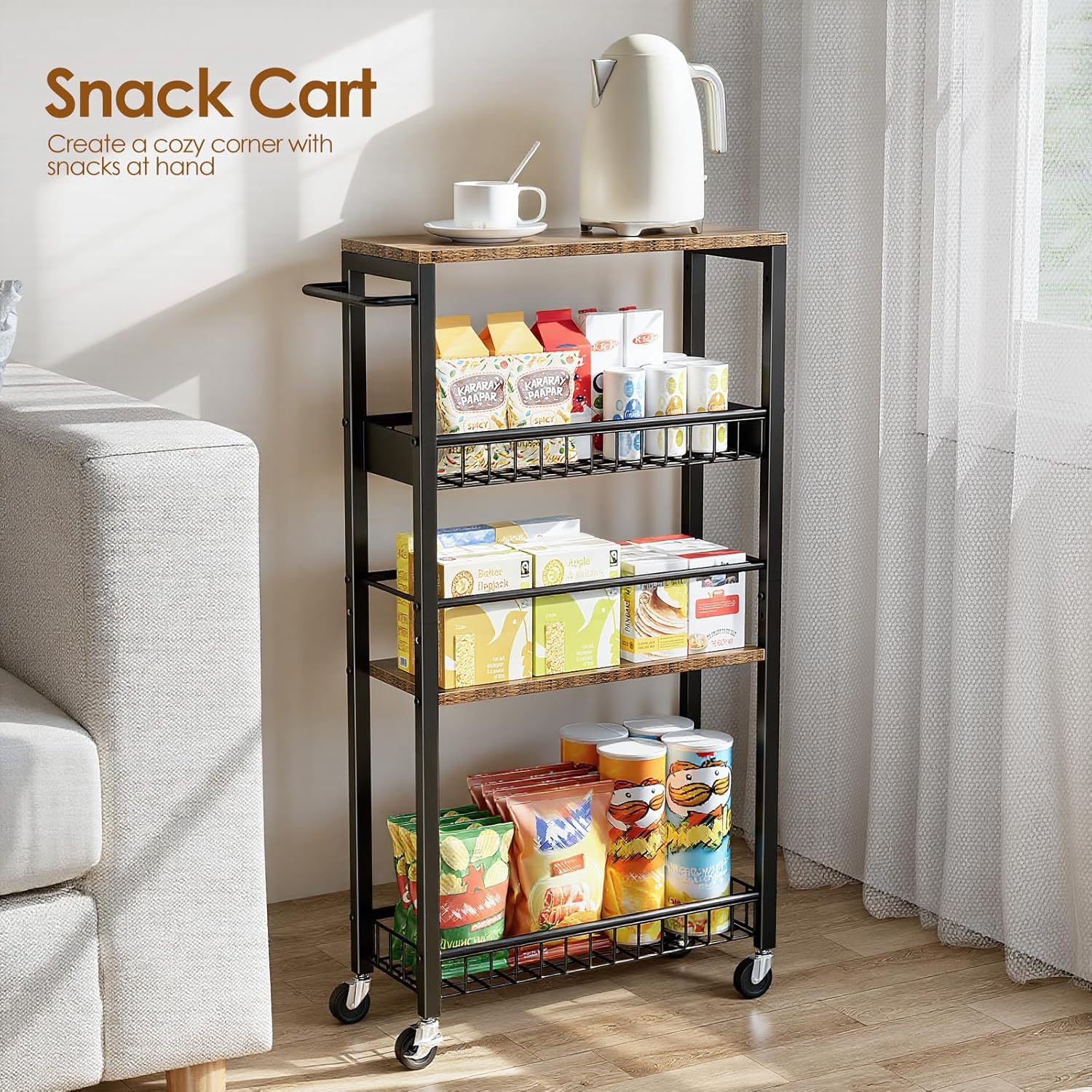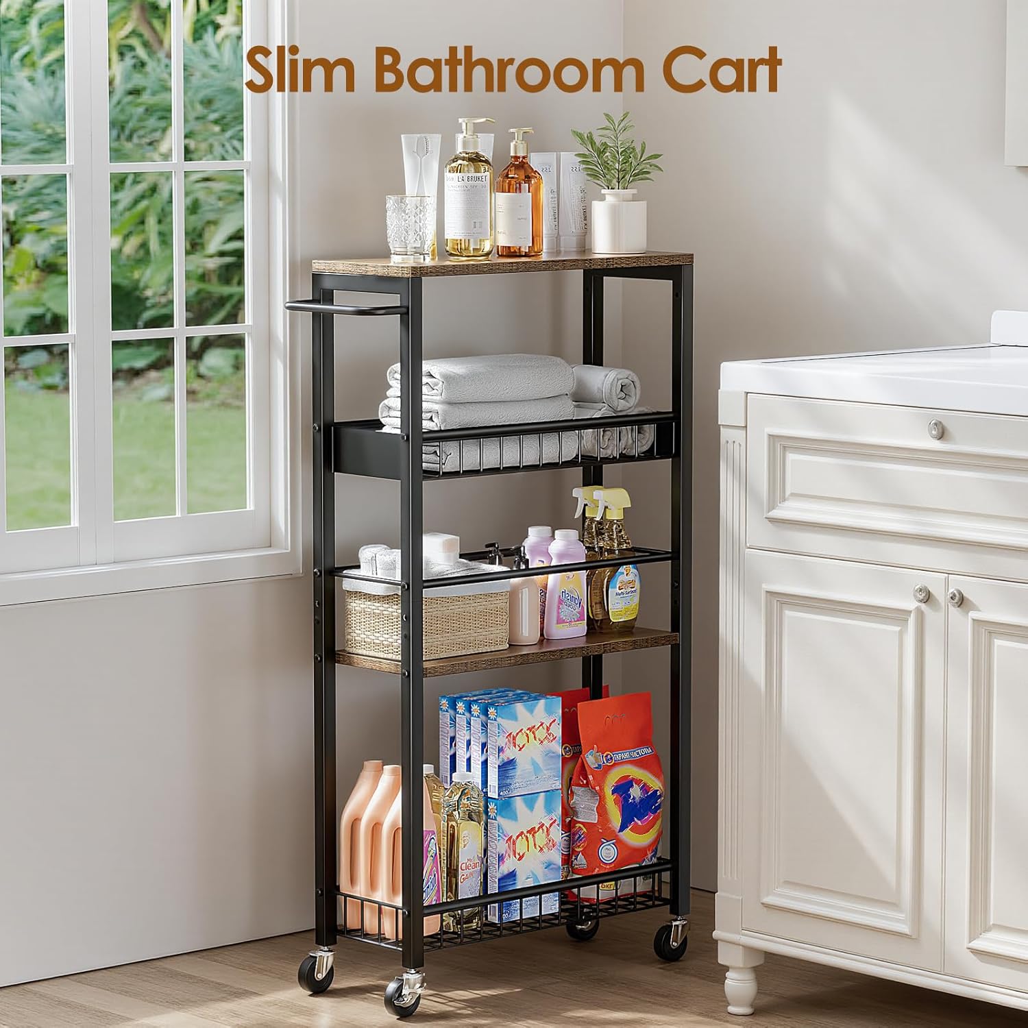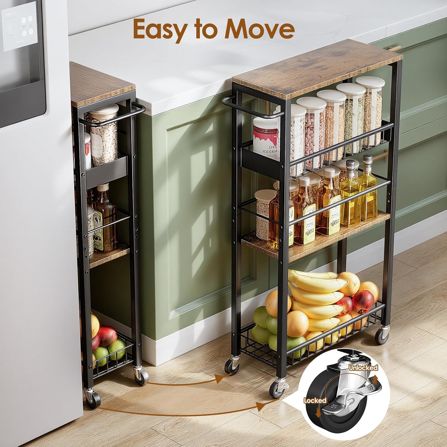 Easy to Move:Equipped with 4 smooth-rolling casters (2 with brakes), this trolley cart moves effortlessly and locks securely.Simply pull the handle to access stored items effortlessly, and lock two wheels to keep the cart stable when in place.