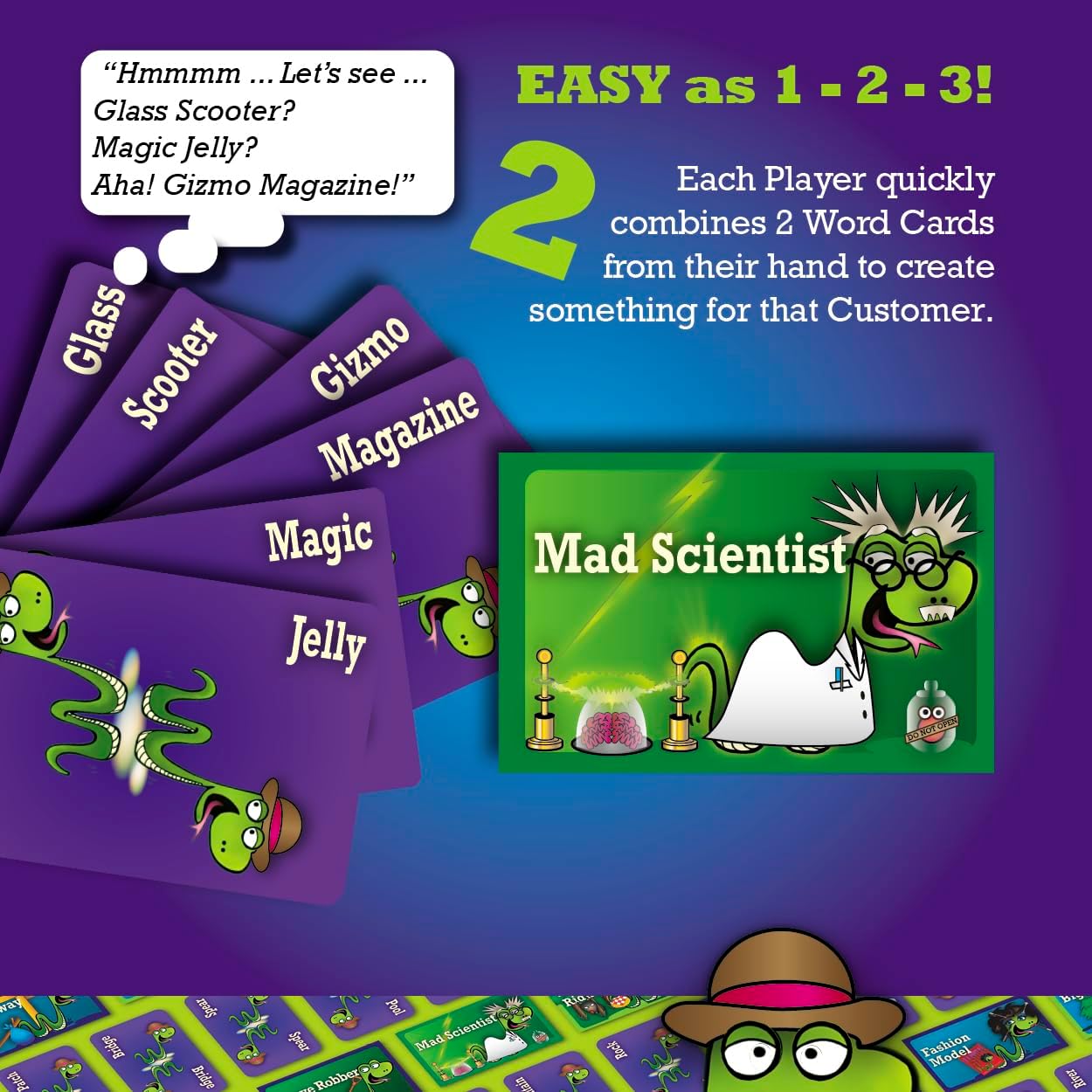 FUN GAMEPLAY: Quickly combine two Word Cards from your hand to create a zany new product – Mermaid Comb! Nap Trophy! Memory Bubble! – and pitch it to the player who is the wacky customer for the round – like Treasure Hunter, Dad, or Mad Scientist.