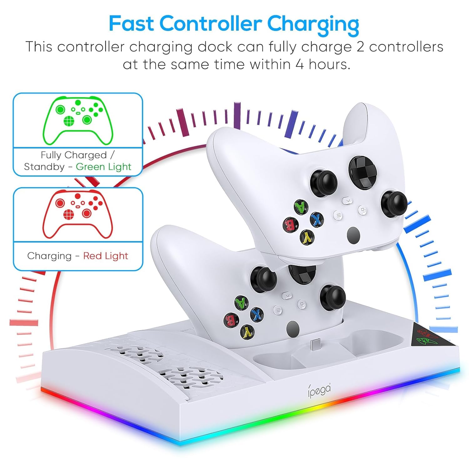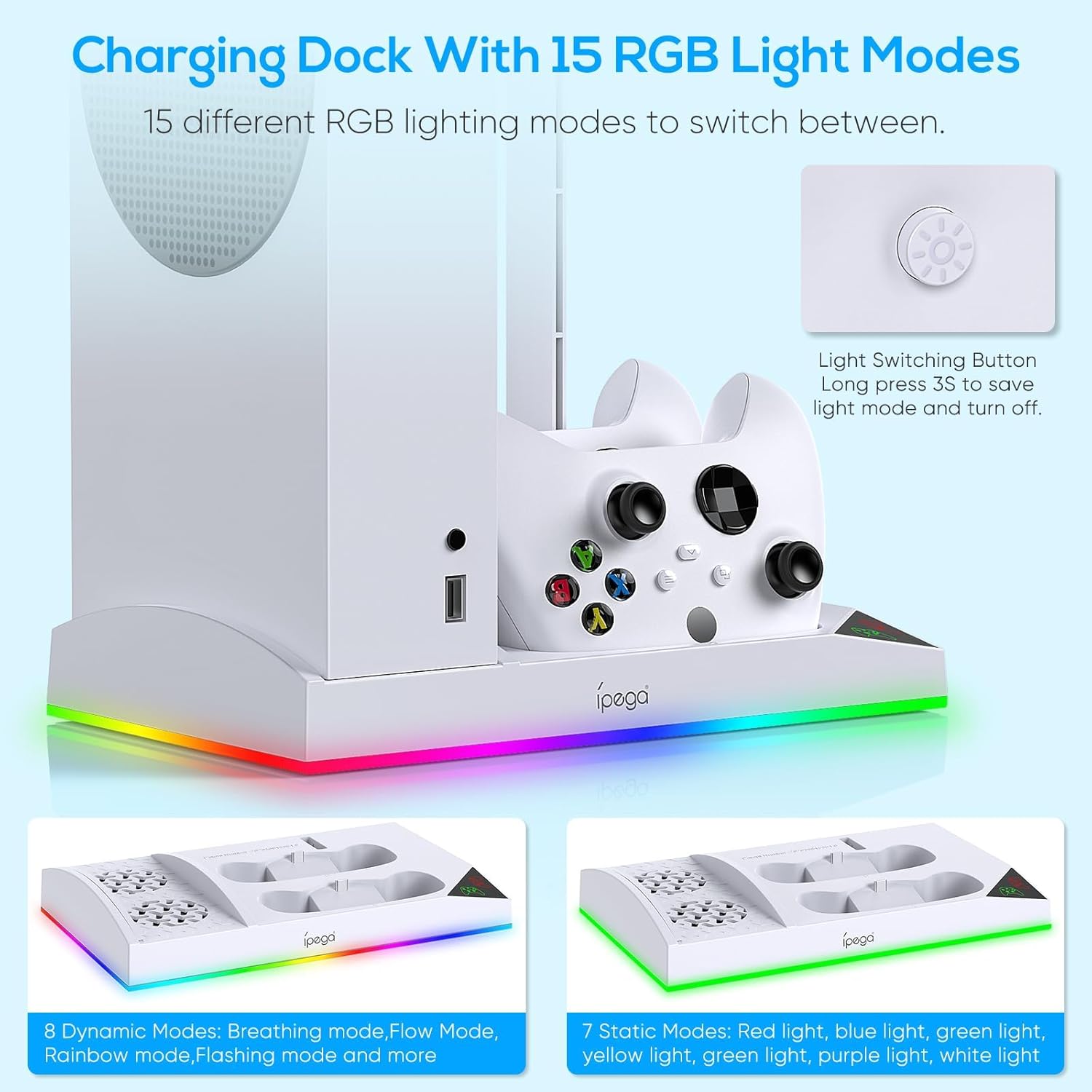 【6 in 1 Stand for XBOX SERIES S】: Vertical stand for Xbox Series S Console, built-in 2 fans for Xbox Series S Console, dual charger for 2 Xbox Series S Controllers,15 Colorfu l Light Modes, Earphone bracket,two 1400mAH battery packs,extra USB port.Good accessories in daily games, holiday Presents are preferred.(NOT FOR XBOX ONE S,ONLY FOR XBOX SERIES S)