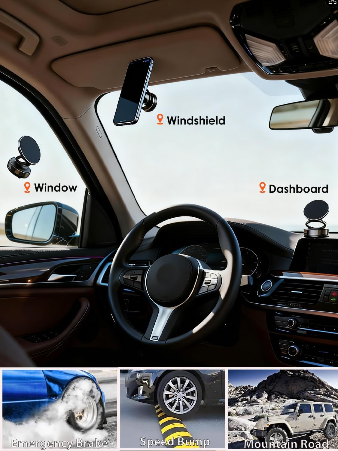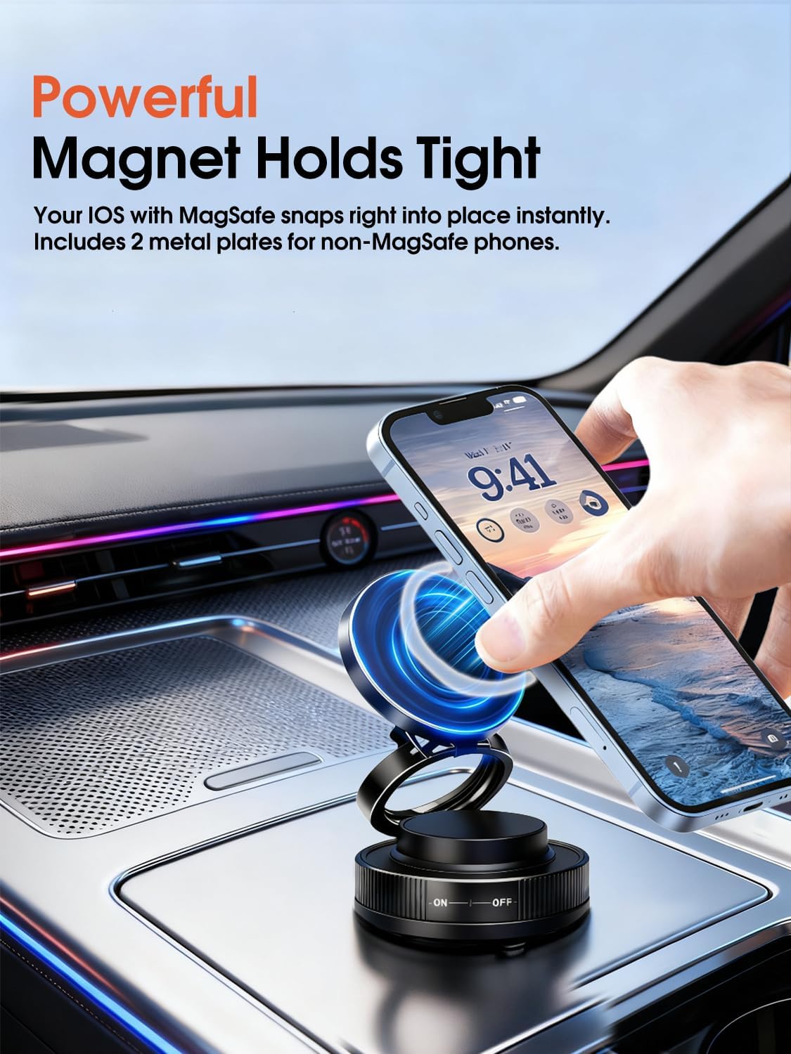 Dual-Ring N54 Super Magnetic Force — 80% Stronger Grip, Stays Put Even on Bumpy Roads: Equipped with an innovative dual-ring N54 magnet array and high-performance magnetic materials, this mount delivers a super-strong and evenly distributed magnetic field. Your IOS with MagSafe snaps right into place instantly. Includes 2 metal plates for non-MagSafe phones. Perfect for stop-and-go traffic, sharp turns, or rough roads — your phone stays attached securely, so you stay focused and stress-free.