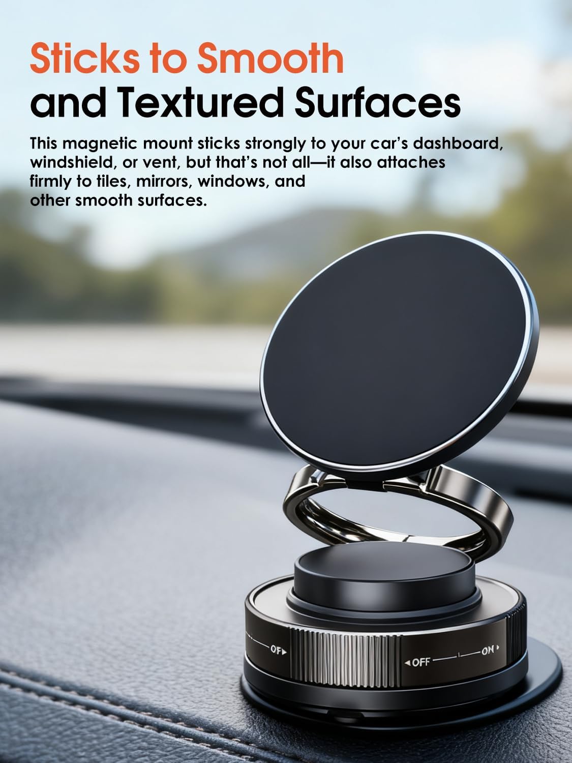 360° Rotation & Triple-Axis Adjustment — Flexible and Stable: The T28 car phone mount features a precision-engineered triple-axis structure — with a 360° rotating base, 180° adjustable magnetic head, and 180° foldable metal arm. Built with high-grade alloy joints and tested over 3,000 times for extreme durability, it outperforms industry standards. Navigate, watch videos, or take calls—just one twist locks your phone in place. Keep your eyes on the road and your drive smooth and safe.
