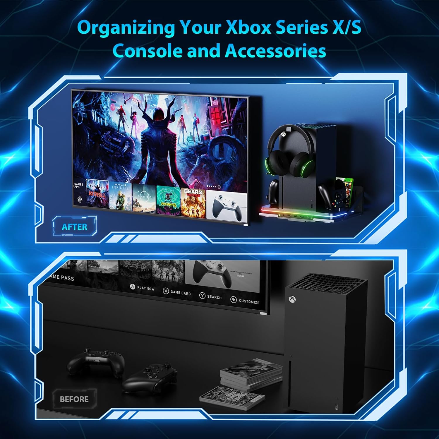 【Headset Stand & USB Ports】The Xbox Series X/S Charger dock station with Headset Stand. 3 USB ports on the front give the option to charge or power up other devices you may need to play the game with, Such as mouse, keyboard, wired controller and other gaming devices. Minimise the space taken up by accessories and keep the play area tidy.
