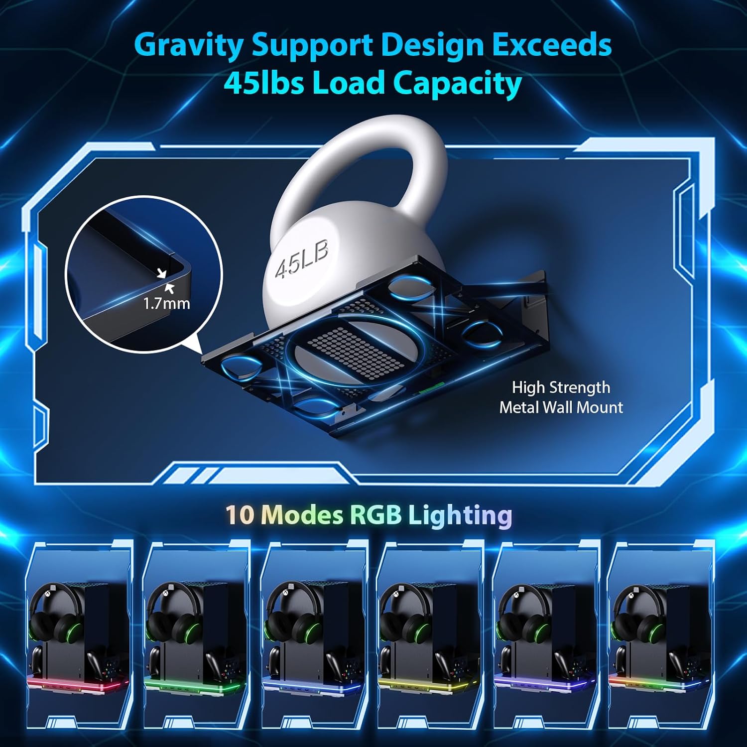 【Designed for Xbox Series X/S Wall Mount】This wall mount for Xbox series X/S is made of High-quality metals for reliable strength and durability, which allows it to bear up to 45 lbs. This wall mount can place your console to be front facing, and it won’t block all ports and disk drive on the console. It can safely store your console, headset, controllers. you can install this wall mount on the left or right side of the TV to give you the best gaming experience on the big screen.