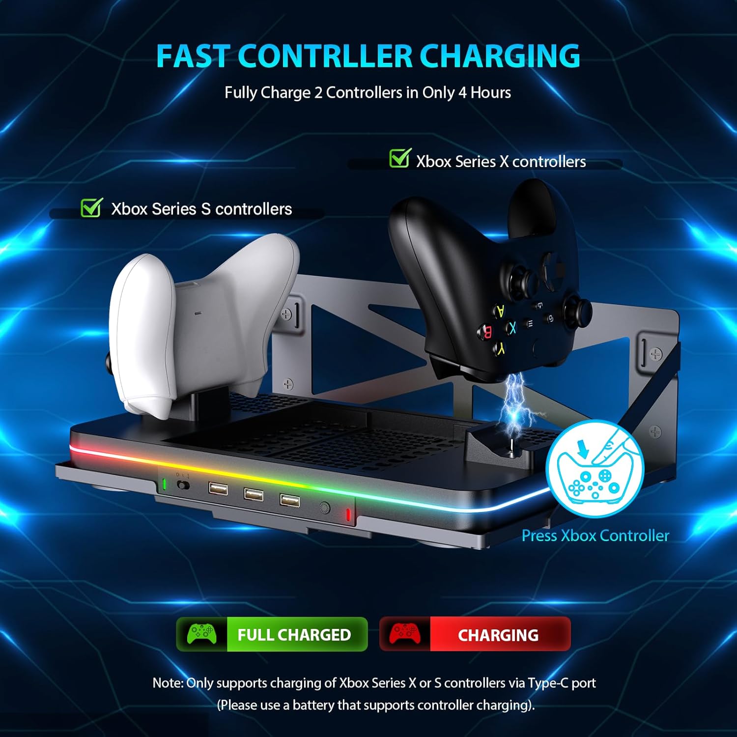 【Fast Dual Controller Charger】 The controller charging dock with LED Indicator for Xbox Series X/S, Can fully charge 2 Xbox Series X/S controllers. LED indicators let you know the charging status at a glance. The controller indicator light is red to indicate that it is charging, and green to indicate that it is fully charged or in standby. No need to wait, save your time and enjoy more fun. (Note: Only supports charging of Xbox Series X or S controllers via Type-C port, Please use a battery that supports controller charging).