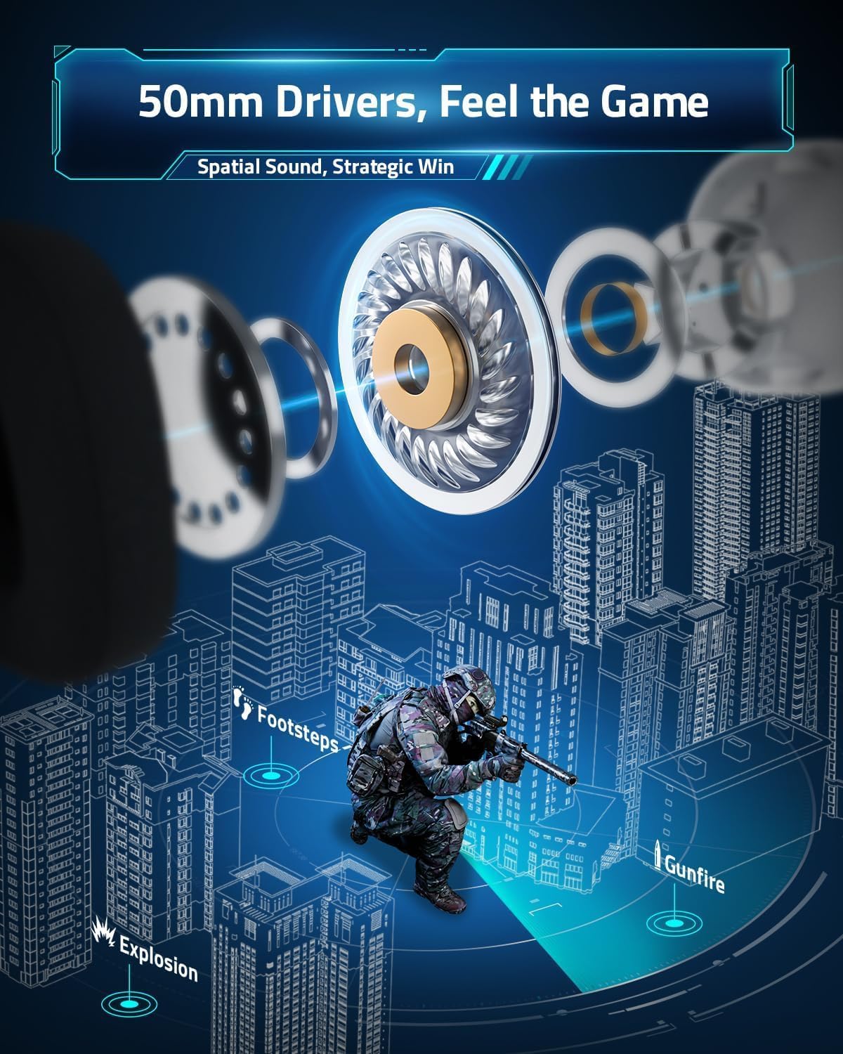 【𝐖𝐢𝐫𝐞𝐥𝐞𝐬𝐬 𝐅𝐫𝐞𝐞𝐝𝐨𝐦, 𝐈𝐦𝐦𝐞𝐫𝐬𝐢𝐯𝐞 𝐏𝐫𝐞𝐜𝐢𝐬𝐢𝐨𝐧】Unleash the full potential of gaming with our 2.4GHz ultra-low latency wireless gaming headset, offering up to 49 feet of unrestricted movement in unobstructed spaces with imperceptible latency (≤20ms) for a smoother gaming experience. Combined with a 50mm dynamic coil driver, allowing you to clearly perceive directional sounds, footsteps, and every detail in the game for an immersive gaming world