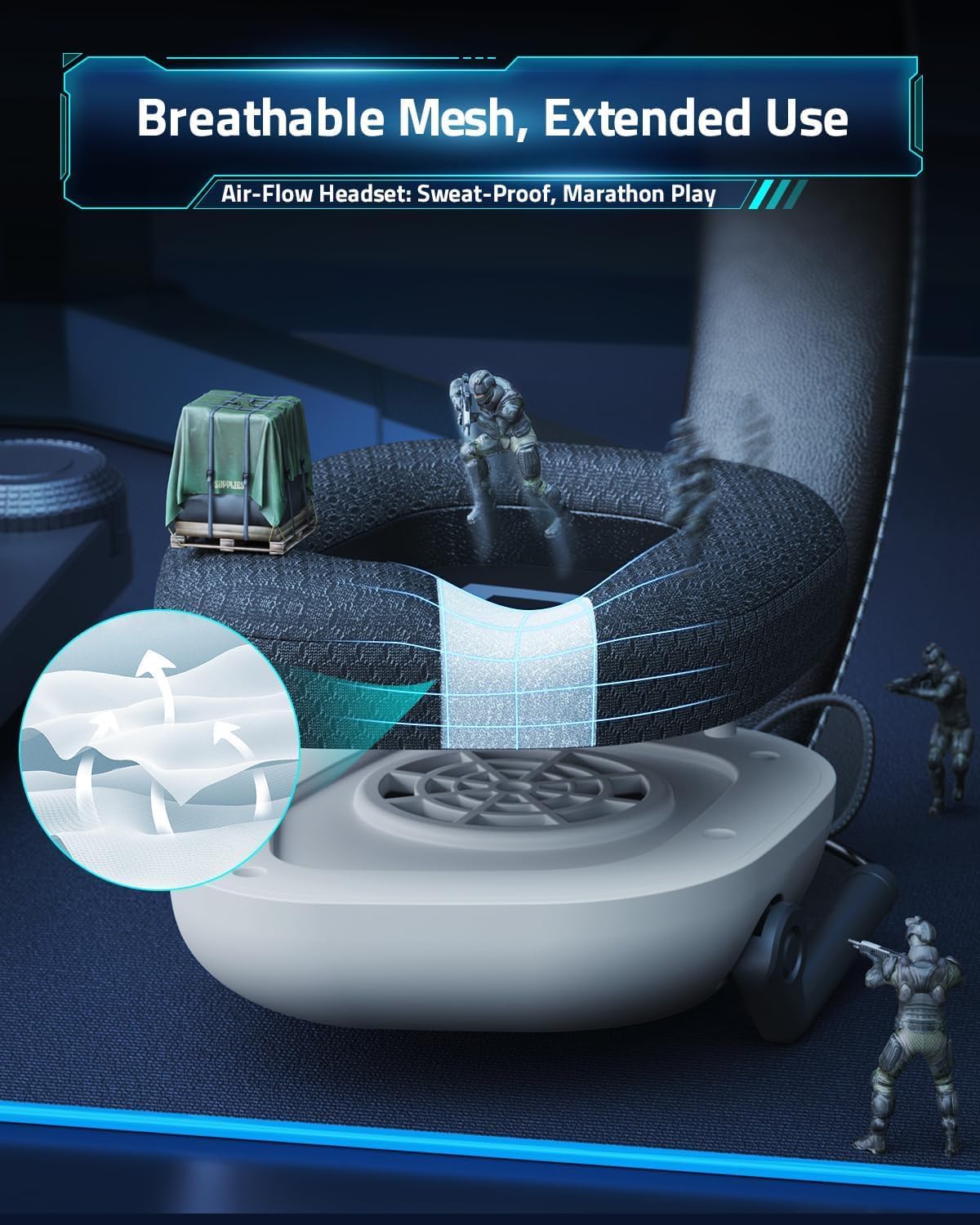 【𝐋𝐢𝐠𝐡𝐭𝐰𝐞𝐢𝐠𝐡𝐭 𝐂𝐨𝐦𝐟𝐨𝐫𝐭, 𝐆𝐥𝐨𝐰𝐢𝐧𝐠 𝐒𝐞𝐬𝐬𝐢𝐨𝐧𝐬】Ultra-lightweight gaming headset (only 8.8 ounces) delivers limitless comfort for long sessions. Soft, breathable mesh ear pads keep you cool and stuffiness-free, even during intense gaming marathons. Stylish breathing lights add personality, casting a sleek glow to elevate your dark-mode gaming experience