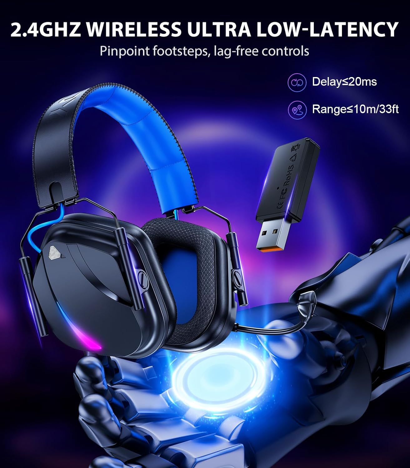 【Ultra-Low Latency, Stable Connection】This wireless gaming headset uses advanced 2.4GHz technology with ultra-low latency (≤20ms) for smooth, lag-free gameplay. Enjoy a stable connection with a range of up to 49 ft, perfect for FPS